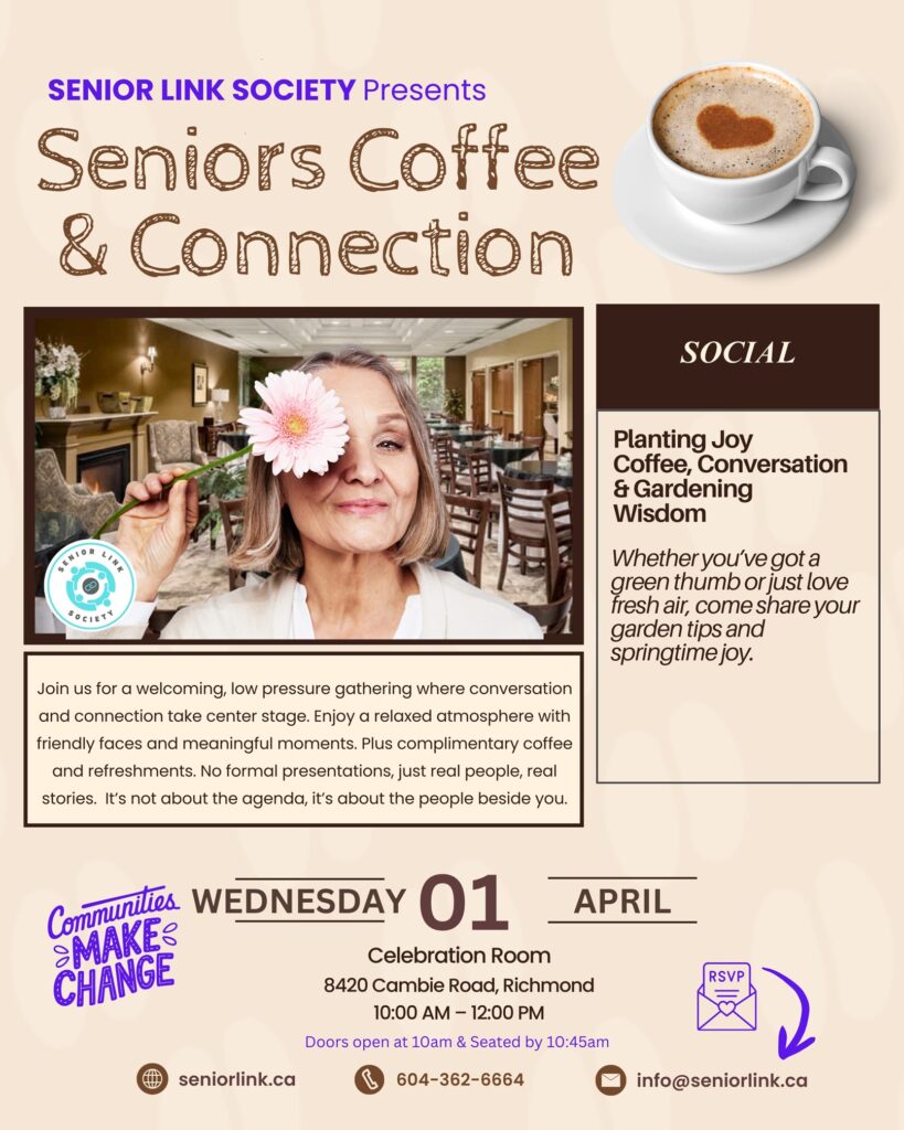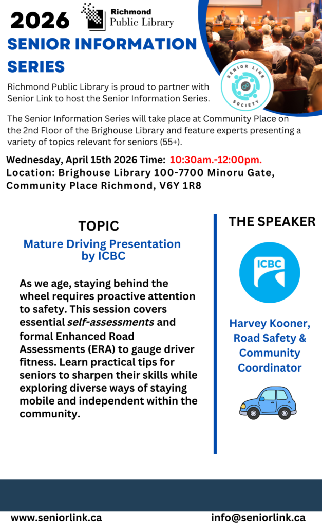 We host annual events that bring together a diverse community of seniors in the Lower Mainland, BC. Senior Link hosts monthly presentations at the Brighouse Library for those seniors (55+) and caregivers on a wide range of topics relevant to enhance knowledge and resources available.